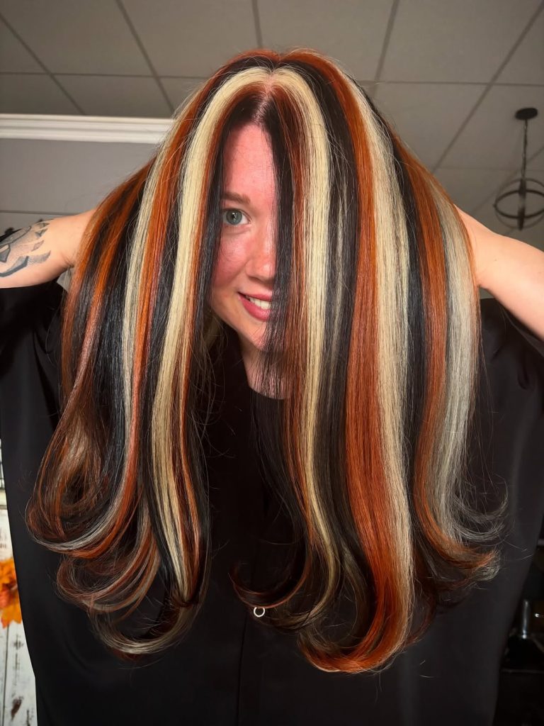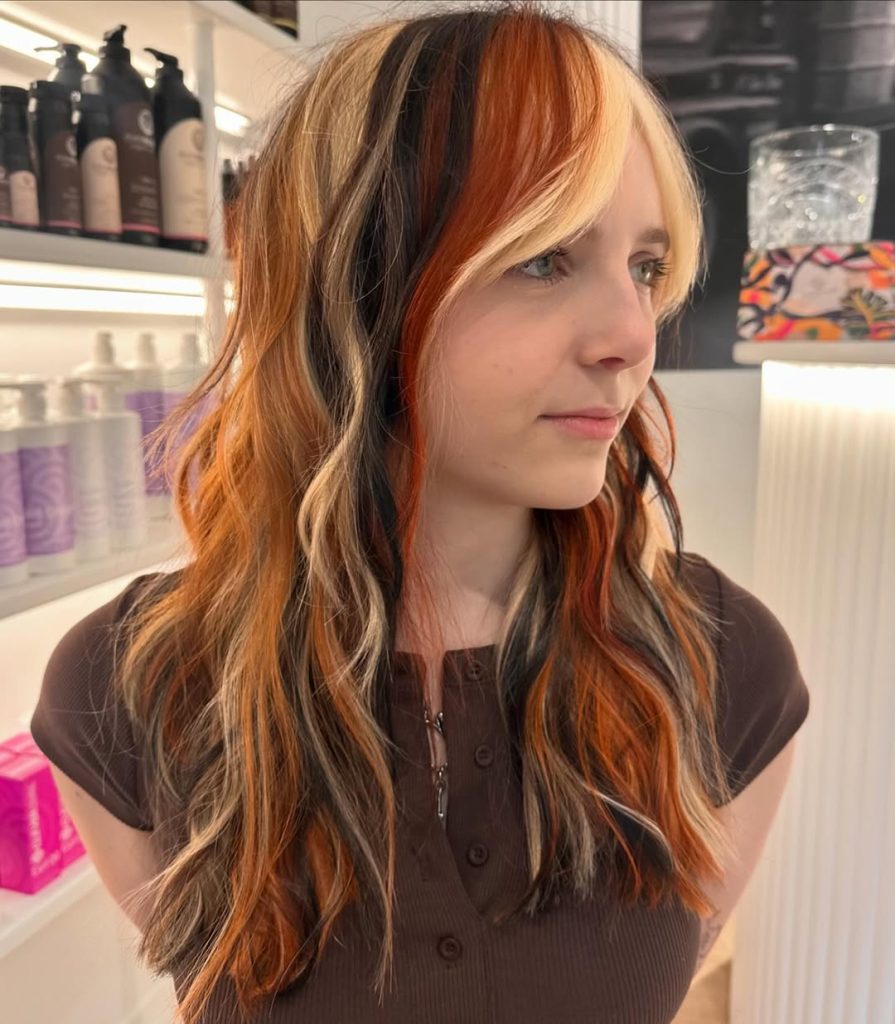 This is the definition of playful hair. With orange, blonde, and black blending together in chunky sections, it feels like an artistic take on calico color patterns. The loose waves soften the bold shades, giving it a romantic but edgy finish. It’s bold without being intimidating, with a youthful energy that’s hard not to love.