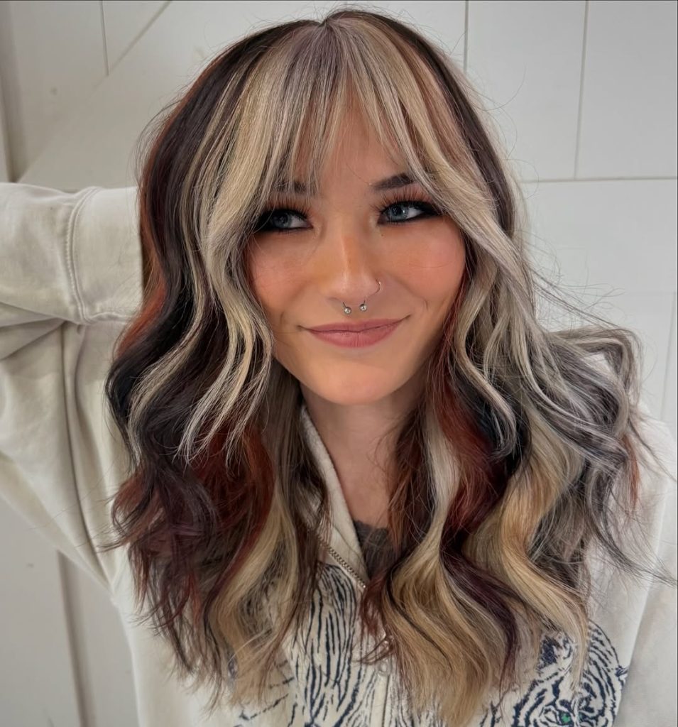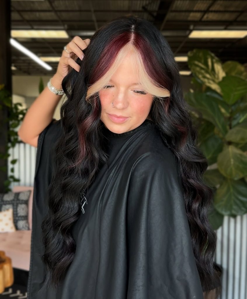 There’s something both elegant and edgy about dark, flowing waves with bold blonde curtain highlights at the front. It frames the face like a spotlight, adding brightness where it’s most flattering, while the darker lengths keep it sophisticated. The deep red accents blended in add a hint of warmth without stealing attention from the striking blonde.