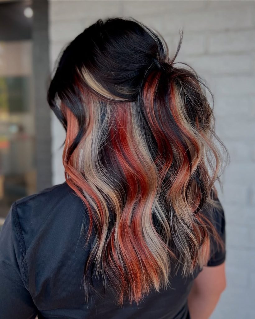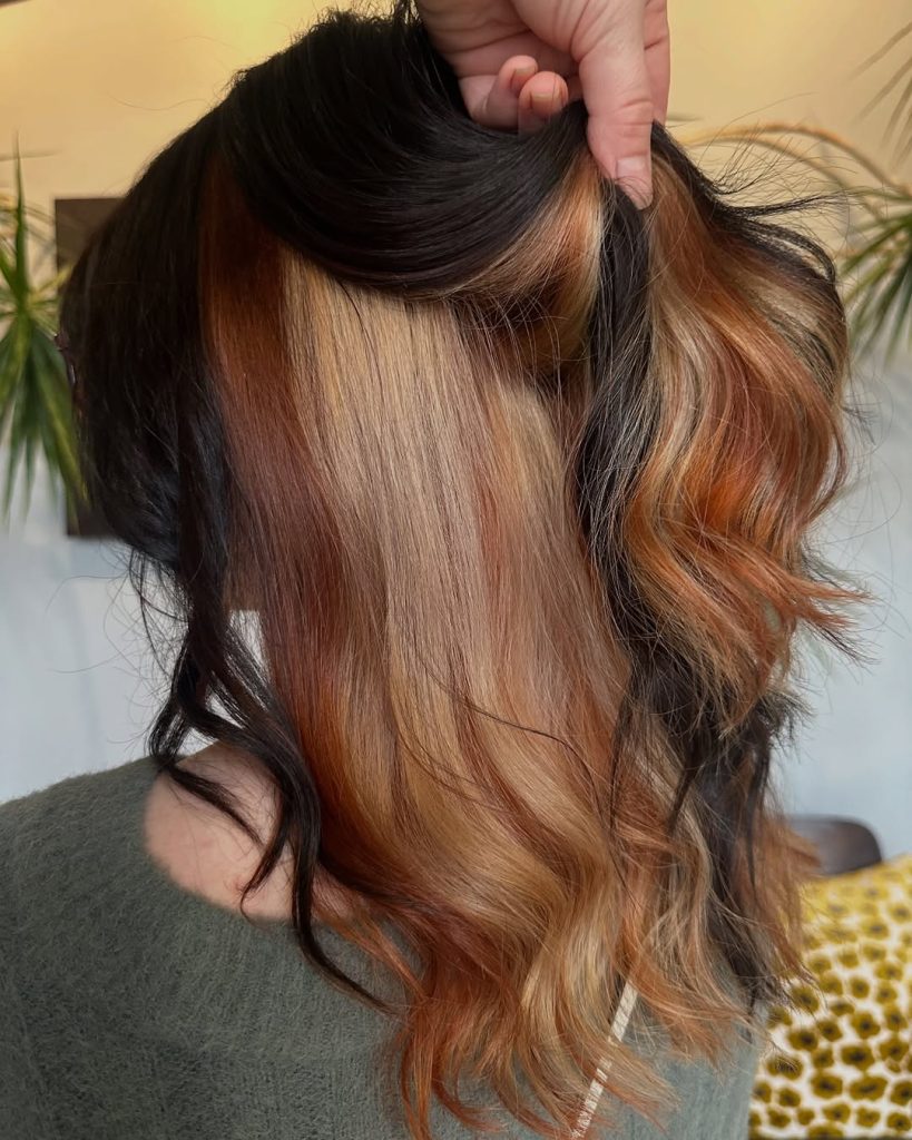 This hairdo gives the impression of revealing a tiny treasure. It is a combination of black on top and a concealed waterfall of warm blonde, copper, and ginger at the bottom which surprises you with its movement. The wavy strands really do the magic as they brighten every hue, thus producing a 3D-like glow that is both warm and daring. It is simply the perfect mix of subdued and adventurous.