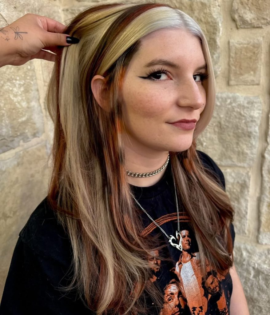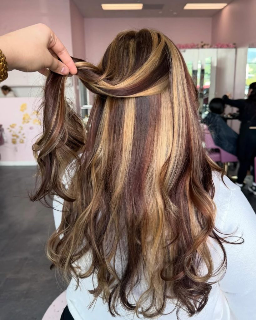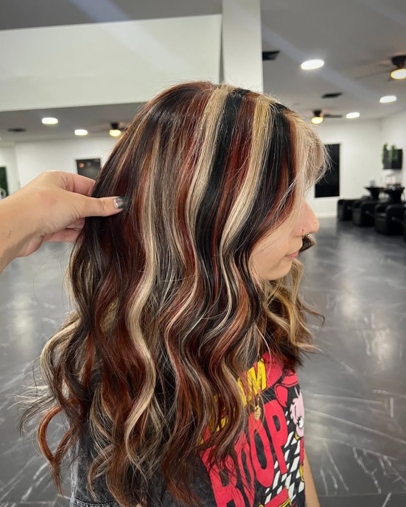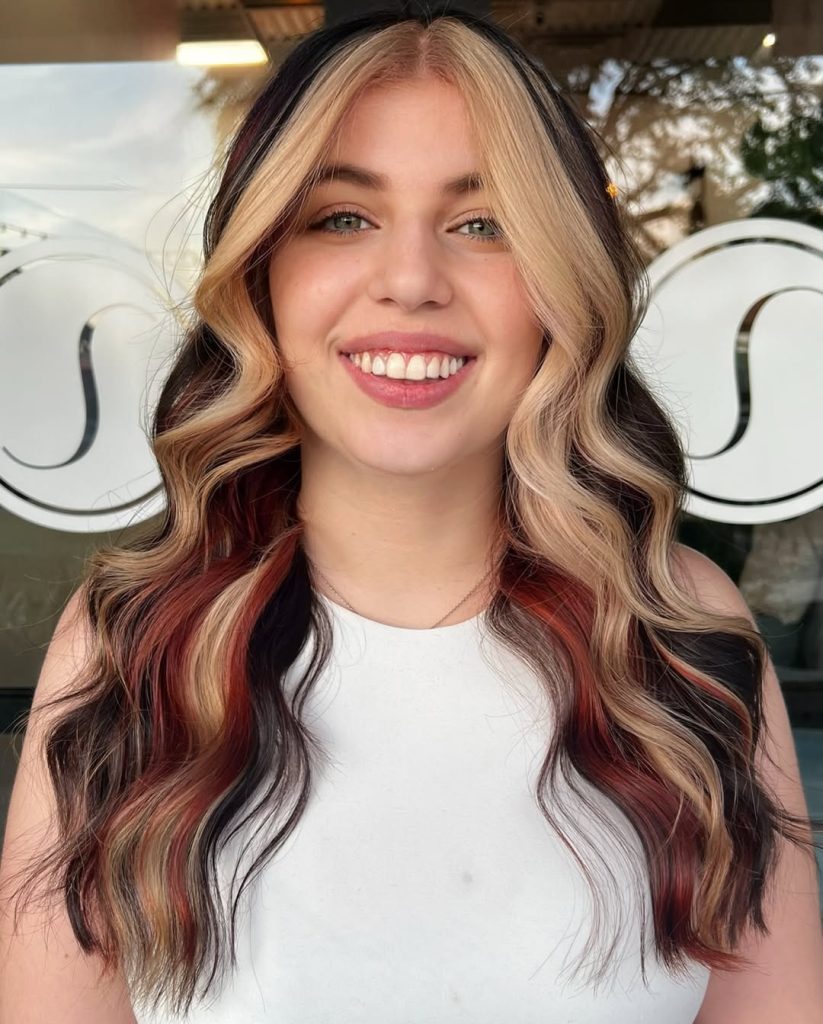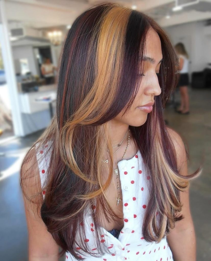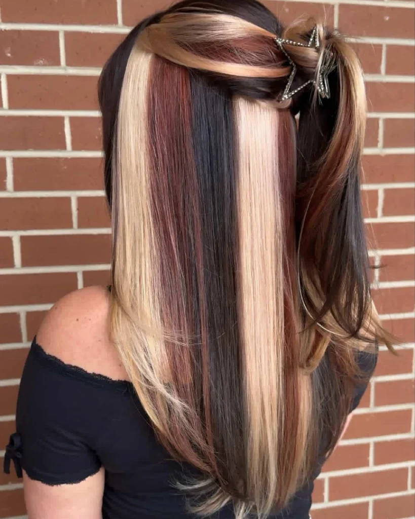 Long hair with chunky stripes of blonde, burgundy, and brown gives this style a painterly effect. It’s both romantic and bold, the kind of look that shows personality without shouting. The half-up twist lets the dye placement shine while keeping the overall vibe soft and feminine.