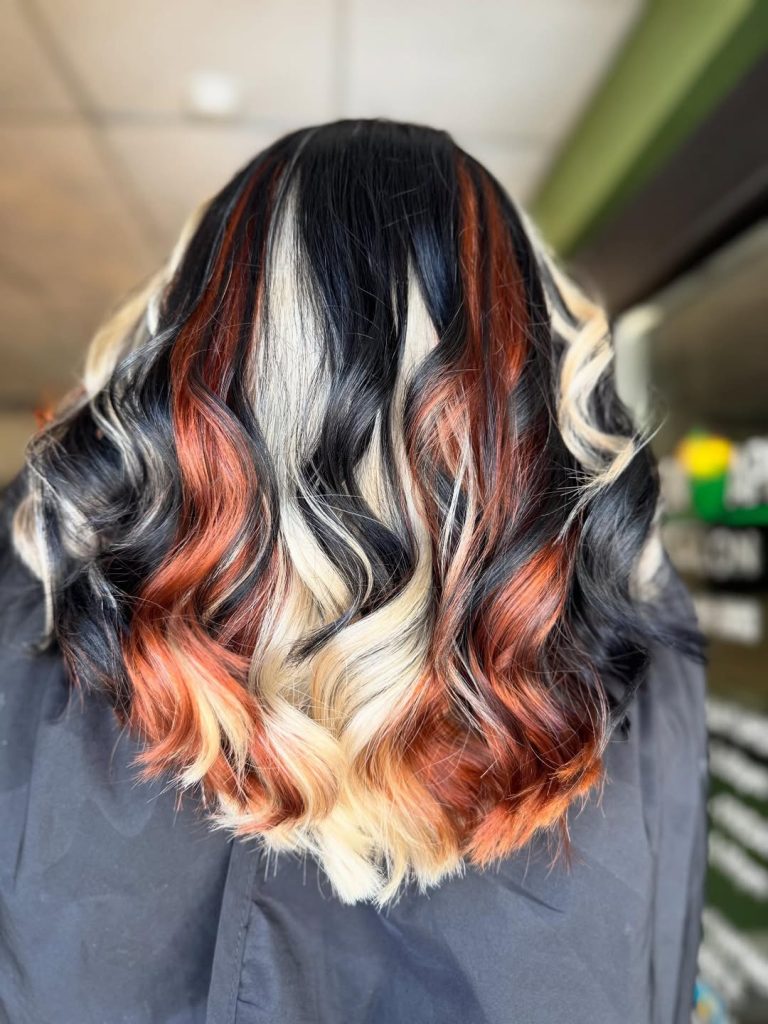 This hairstyle looks like fire and ice dancing together. With platinum blonde, black, and fiery red woven into mid-length waves, it creates a dramatic calico effect that feels powerful yet playful. The boldness of the palette makes every curl pop, turning the hair into a statement accessory on its own.