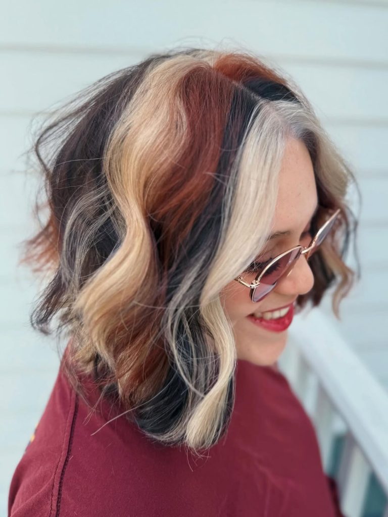 This chin-length cut with blonde, black, and copper patches is a playful nod to classic calico patterns. It’s vibrant, fearless, and chic all at once. The bouncy bob shape keeps the overall feel modern and lighthearted, while the colors add all the drama you need.