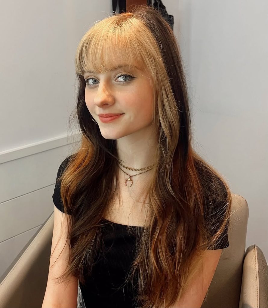 This cut works best for medium to long lengths, especially if you like wearing your hair down. Straight styles or loose waves both highlight the blended colors, while the bangs draw attention to the eyes. For extra impact, keep the fringe smooth with a flat iron and let the rest flow naturally.