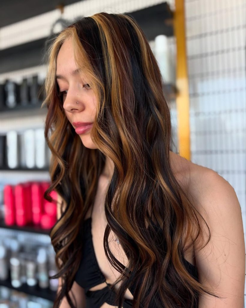 Long, cascading waves with caramel, blonde, and dark undertones give this hairstyle a soft yet striking finish. It carries a slightly bohemian energy, playful yet elegant, with the kind of natural dimension that makes people look twice. The balance between light and dark shades feels sun-kissed and effortless, as though it came straight from a summer vacation.