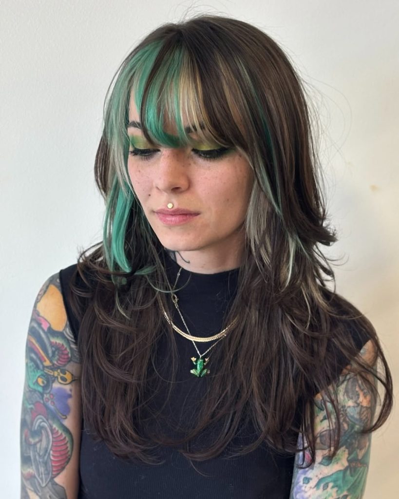 This hairstyle brings in an unexpected twist — green bangs and peekaboo streaks mixed into soft brown layers. It feels daring yet fun, almost like stepping into a new season of life with a pop of color hairstyles no one expects. The fringe brightens the eyes, while the soft layering keeps the look flowing and romantic.