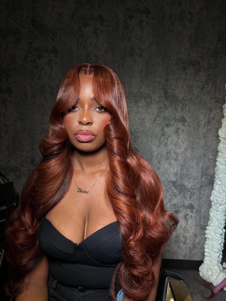 This chestnut hairstyle with red undertones and bangs brings a fun, flirty energy. The rich, warm color lights up under the right angle, giving it a radiant glow, while the bangs add personality and charm. It’s a perfect blend of boldness and softness, creating a look that feels vibrant and playful.