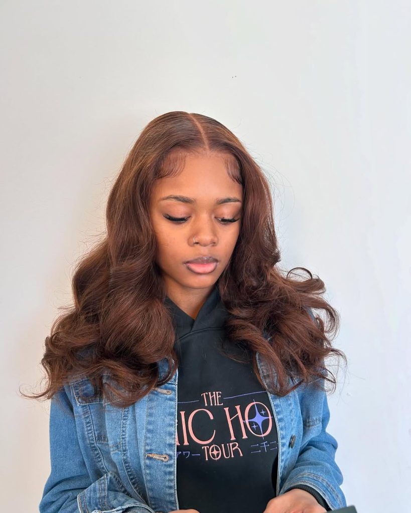 This look is especially flattering on Black women who want to experiment with a warm chestnut shade that enhances brown skin beautifully. The long layers help elongate the face, and the color pairs seamlessly with bold makeup or neutral tones. Maintaining shine is key, so lightweight oils or serums are perfect for keeping the hair glossy. It’s a versatile style that can shift from a professional setting to a glamorous evening without missing a beat.