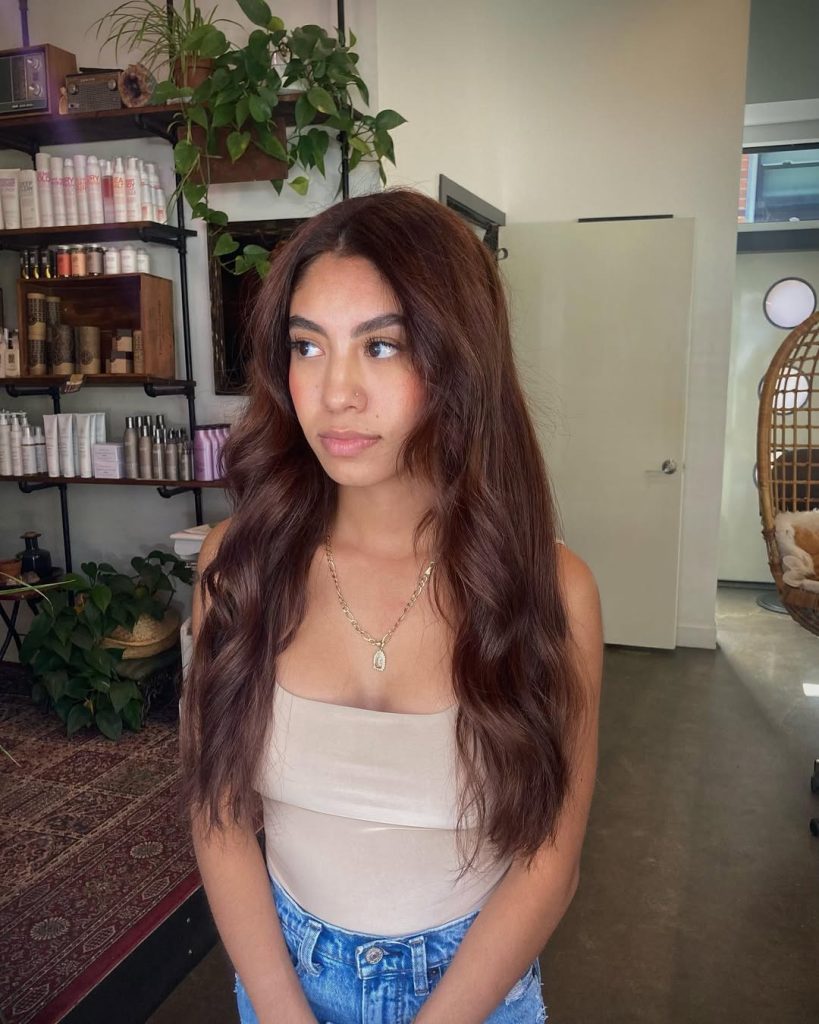 There’s something instantly magnetic about long chestnut brown waves. The soft flow of this color makes the hair look both youthful and refined, almost like the strands were kissed by golden autumn light. It’s rich without being overpowering, giving off that subtle elegance that never shouts but always gets noticed. A style like this feels timeless yet modern, making it the kind of look that works just as beautifully for coffee with friends as it does for a formal evening.