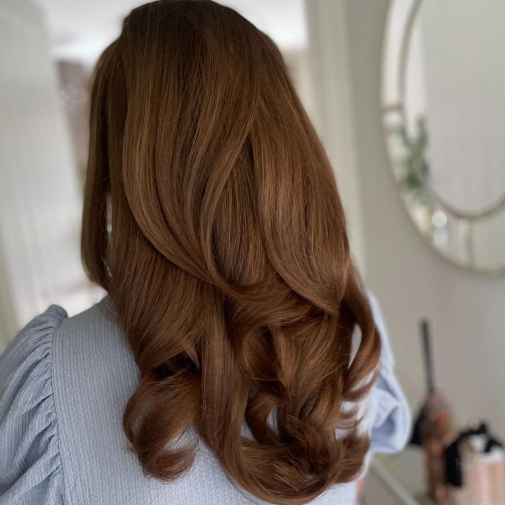 This voluminous chestnut style radiates confidence and glamour. The richness of the color paired with soft, sweeping curls creates a striking effect, adding warmth and depth to the look. It has a bold presence but never feels overwhelming—it’s classy, feminine, and full of movement. The overall effect is powerful yet approachable, the kind of hair that turns heads in the best way possible.