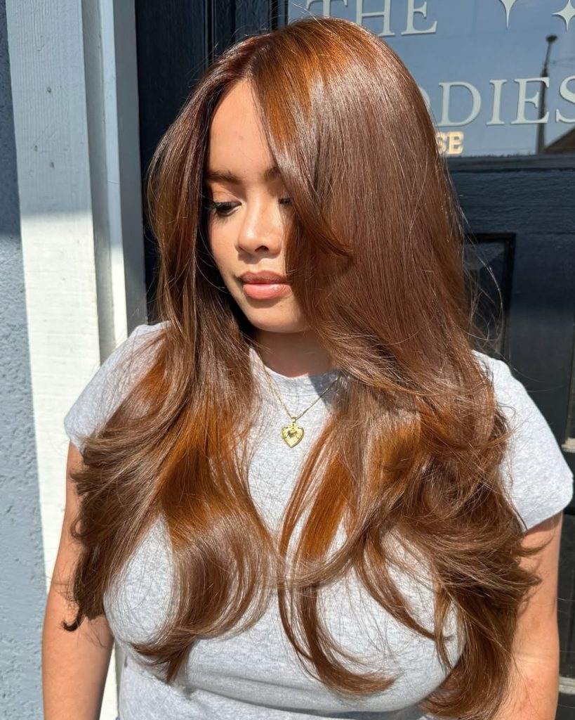 This look works best for women with long, thick hair who want a fresh update without going too light. The layered cut keeps the style airy, while the golden chestnut tones give an uplifting glow. A quick blowout will enhance the shine and shape, making it a go-to style for everyday elegance.