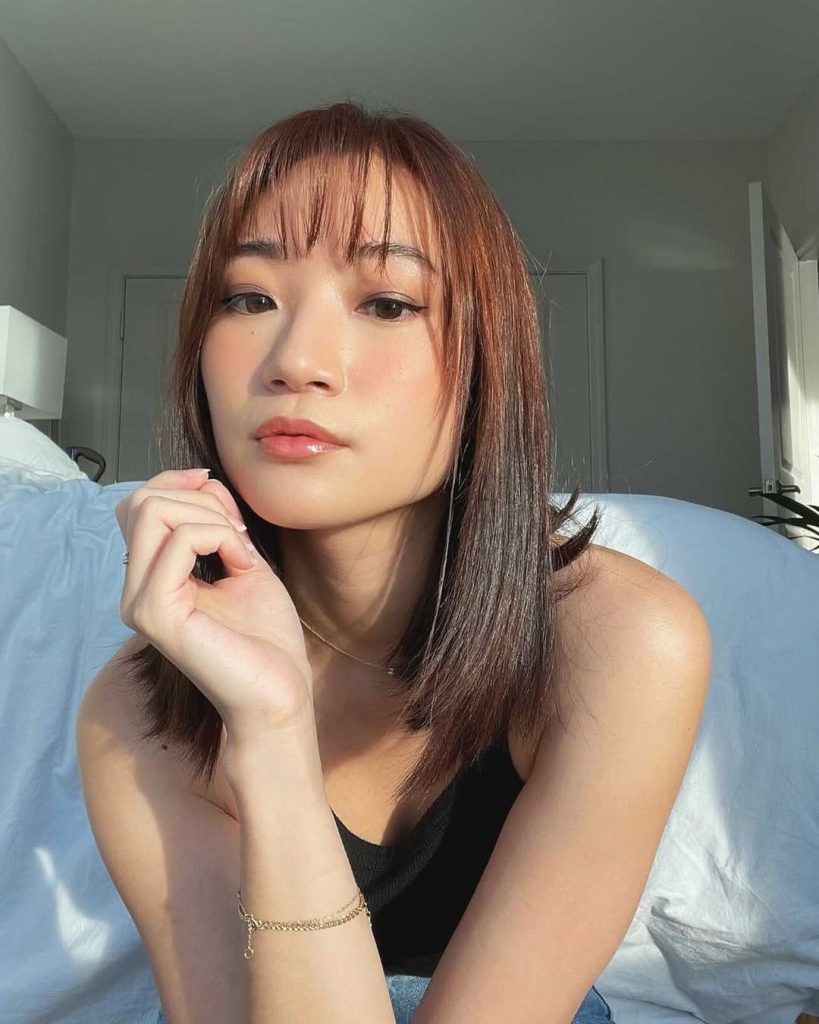 Fresh, airy, and full of personality—this chestnut bob with wispy bangs is the perfect mix of playful and chic. The medium length keeps it light and versatile, while the fringe adds a soft framing effect that draws attention to the eyes. The chestnut color gives warmth to the overall style, enhancing the natural glow of the skin. It’s a haircut that feels like a breath of fresh air—easygoing yet stylish.