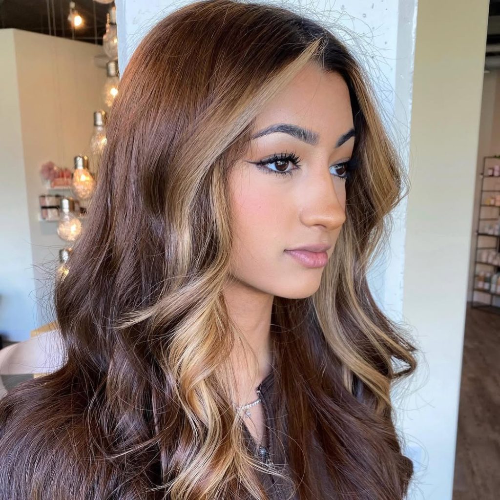 If contrast is your thing, then this look with its mix of chestnut hair and blonde highlighting is exactly what you need—it’s got it all in spades in terms of drama. The lighter portions around the face immediately brighten the skin tone, while the bottom portions ground the look with their rich tone in a way that’s youthful, edgy, yet ever so classic-looking in its feel—it exudes pure confidence suddenly.
