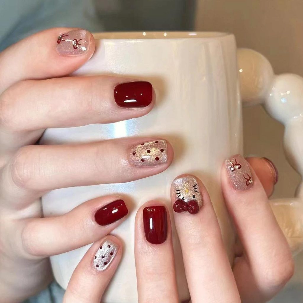 There’s something irresistibly cozy and playful about this manicure. The rich red polish paired with soft glittery nude nails instantly creates that warm, cheerful feeling—like sipping a latte on a chilly afternoon while wearing your favorite sweater. What really steals the show is the adorable Hello kitty accent, sitting sweetly among delicate little bow details and tiny dots. The contrast between glossy Red and soft shimmer gives the whole look a festive personality that feels equally perfect for everyday moments or a fun celebration.