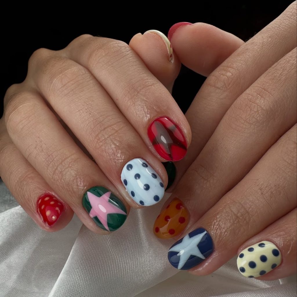 These nails feel like a playful art project brought to life. Each nail features a different Colorful design — bold stars, polka dots, stripes, and vibrant shades that instantly catch the eye. The mix of Red, Blue, Green, and creamy neutrals creates a lively palette that feels cheerful and expressive.