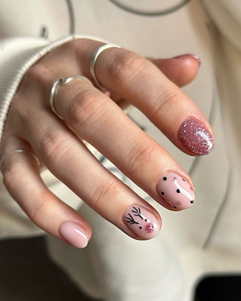 This manicure instantly brings a cozy seasonal mood. The gentle Pink base looks soft and polished, while one nail sparkles with shimmering glitter that catches the light like fresh snow. The adorable reindeer accent adds a playful personality that makes the whole design feel festive and charming without becoming too loud.