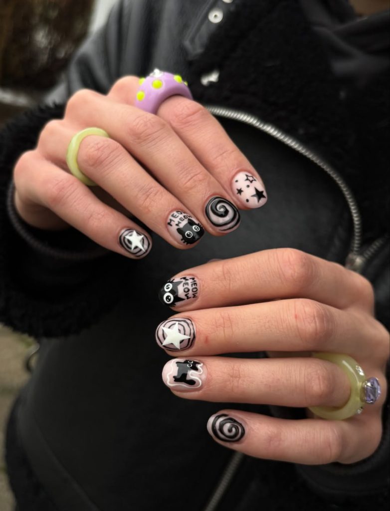 These nails have a bold artistic personality that immediately stands out. The monochrome palette of Black and soft nude creates a striking contrast, while playful cat illustrations, stars, and swirling graphic patterns give the manicure a creative, slightly edgy vibe. It feels fun, expressive, and a little rebellious—perfect for someone who enjoys turning their nails into tiny pieces of artwork.