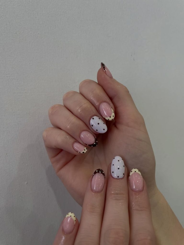 There’s a quiet elegance in this manicure that makes it feel effortlessly stylish. The soft Pink base keeps the nails looking natural and clean, while delicate polka dots scattered across creamy whites and nude accents add just the right amount of visual interest. The subtle contrast between colors makes the design feel refined yet playful.