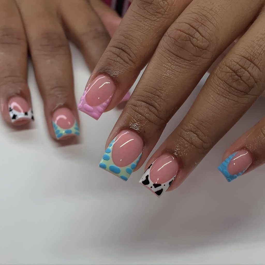 This manicure feels like pure fun. The glossy square pink base keeps the nails looking polished and feminine, while the colorful tips bring playful personality through dotted patterns and graphic accents. The combination of Blue, pink, and contrasting shapes gives the nails a vibrant, creative energy that feels youthful and fresh.
