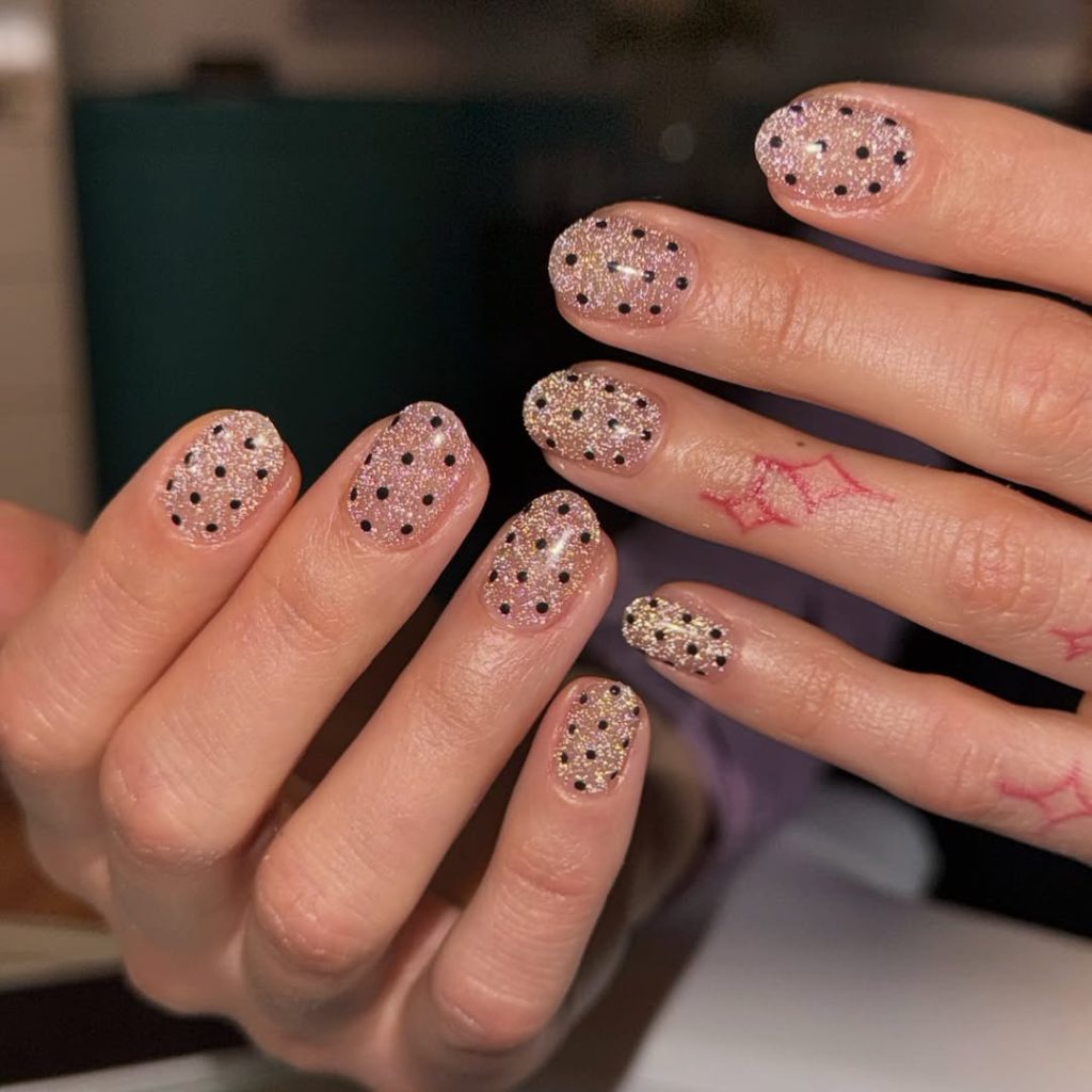 These sparkling nails effortlessly capture the light, exuding a playful vibe without going overboard. The soft glitter base creates a subtle shimmer that makes the hands look elegant, while the tiny Black polka dots add a charming retro twist. It’s the kind of manicure that feels festive but still sophisticated—like a little party happening right on your fingertips. The balance between sparkle and pattern keeps the look captivating while remaining wearable for everyday moments.
