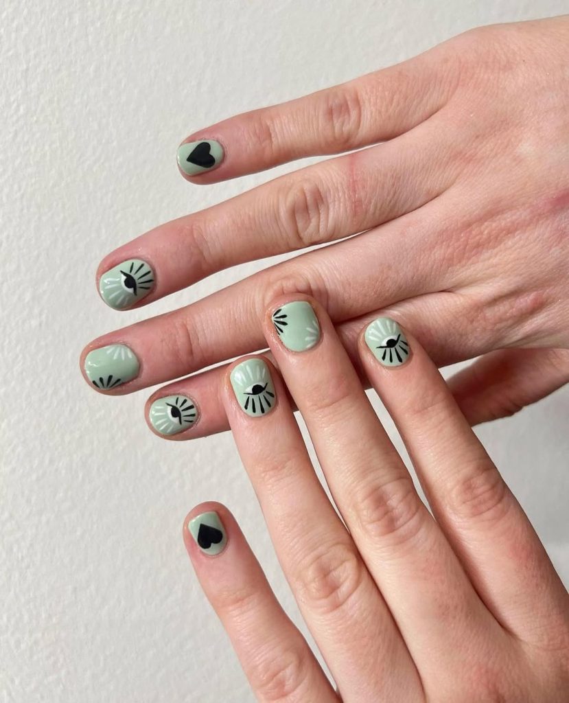 These nails have a calm, artistic vibe that feels both modern and refreshing. The muted Green base gives the manicure a soft earthy tone, while the simple graphic designs—hearts and delicate eye motifs—add personality without overwhelming the look. The contrast between the gentle color and bold Black details makes the design feel thoughtful and stylish.