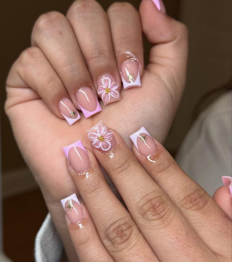 25. Pink Floral French Tip Nails