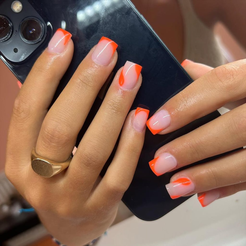 These nails bring instant summer energy. The glossy square shape, paired with bright neon orange French tips, creates a bold, modern look that feels fresh and vibrant. The subtle curved accents on the tips add movement and make the design feel more creative than a traditional French manicure.