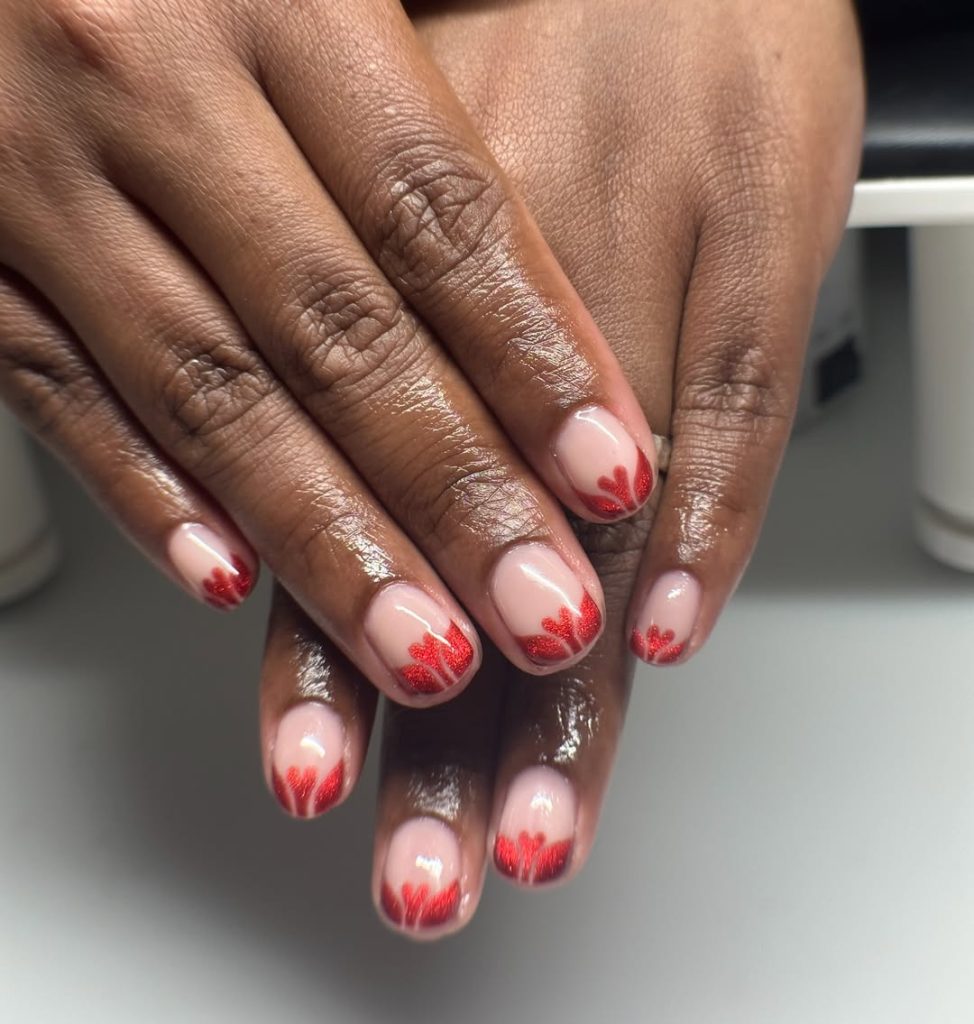 These nails feel playful yet surprisingly elegant. The soft nude pink base creates a clean, glossy foundation, while the rich red tips bloom into delicate petal-like shapes that almost resemble tiny flowers opening at the edge of each nail. The color contrast is beautiful—bold enough to stand out but still balanced by the neutral base. It’s the kind of manicure that quietly catches attention when you gesture or hold a glass at a party.