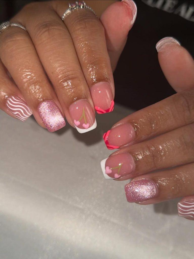 This manicure is pure fun. The glossy pink base looks soft and feminine, while the bright pink French tips bring a playful pop of color that instantly brightens the design. What really makes these nails special are the adorable cherry accents on the middle fingers, adding a sweet and slightly retro vibe. Paired with a sparkly glitter accent nail and wavy white pattern details, the whole set feels lively and cheerful.