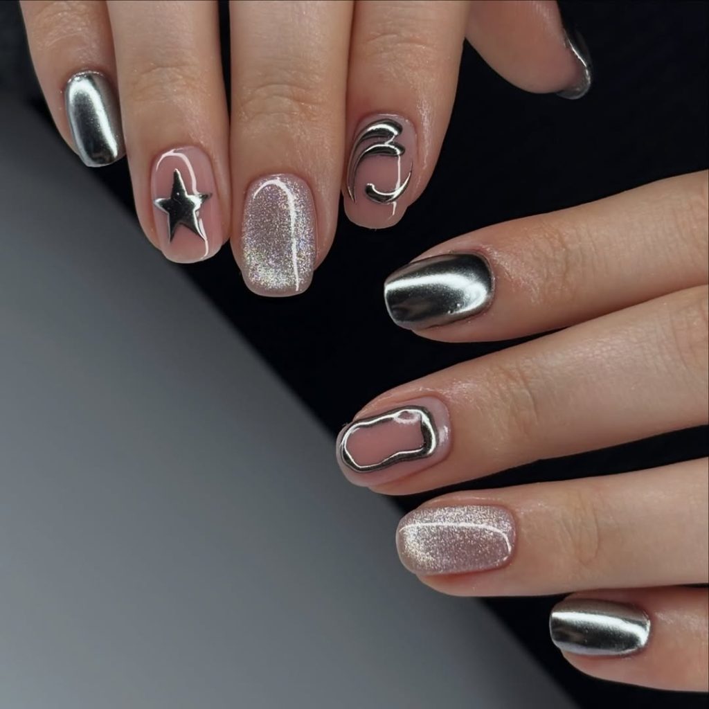 These nails have a sleek, futuristic vibe that feels effortlessly cool. The reflective chrome polish instantly draws attention with its mirror-like shine, while the nude base on the accent nails keeps the look balanced and modern. The metallic star detail and flowing chrome swirl create a sculptural effect that almost looks like jewelry placed directly on the nails.
