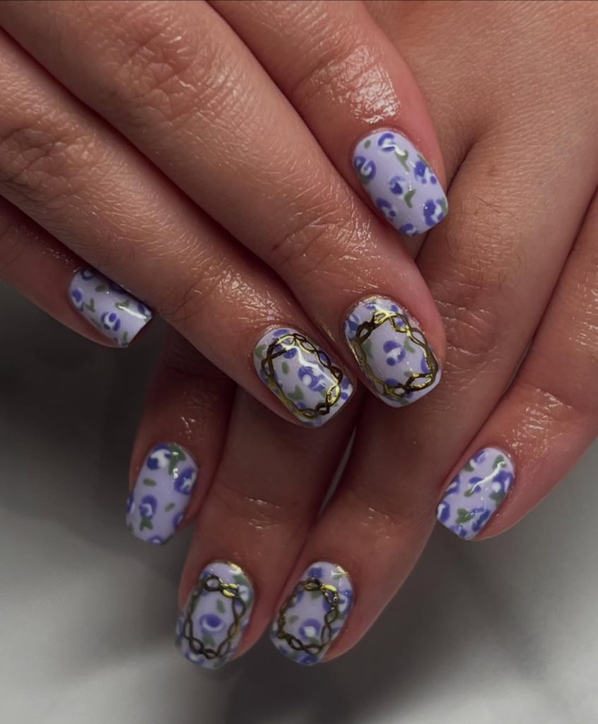 These nails look like tiny pieces of vintage porcelain. The soft lavender base combined with delicate blue floral patterns creates a charming, almost antique aesthetic. The gold decorative frames painted on two nails elevate the design even further, giving it a luxurious touch that feels both artistic and elegant.