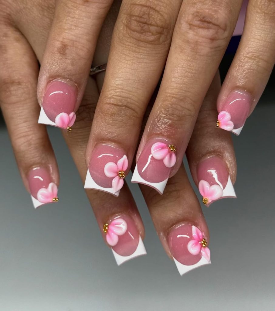 This manicure has a soft, romantic charm that immediately feels graceful and feminine. The glossy pink base creates a delicate foundation, while the crisp white French tips add that classic polished look everyone loves. The real highlight is the sculpted pink flowers placed gently on the nails, accented with tiny gold beads that give the design a subtle touch of elegance.