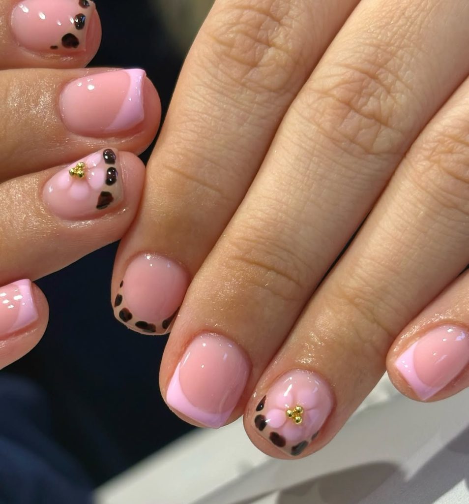 This manicure has a playful personality that instantly brightens your mood. The soft nude base keeps the nails elegant and natural, while the tiny orange and white daisies bring a cheerful burst of charm. The delicate leopard-style French tips add the perfect amount of contrast, making the design feel both fun and slightly edgy at the same time. It’s the kind of manicure that feels relaxed and effortless—like a sunny afternoon, a denim jacket, and your favorite casual outfit.
