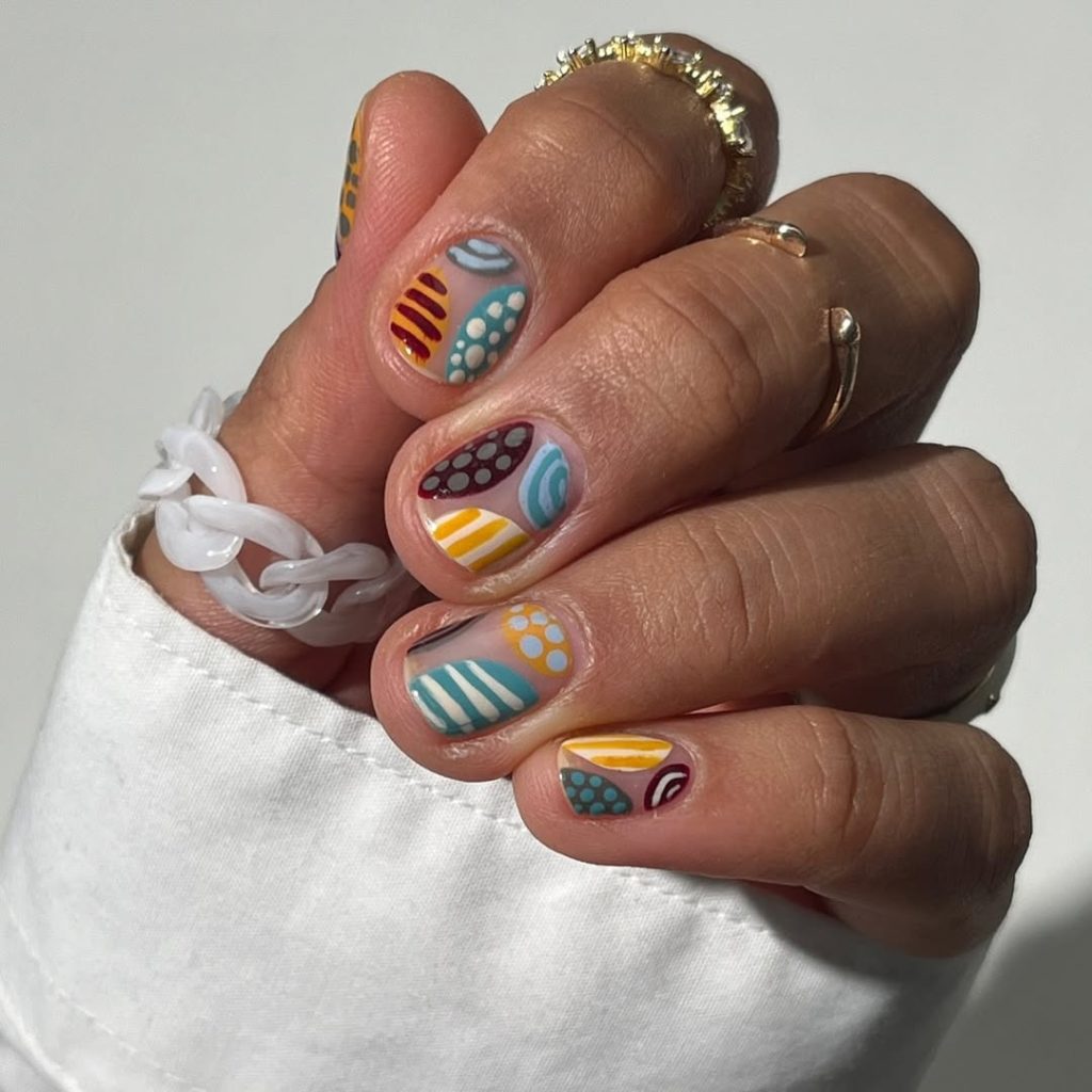 These nails feel like a burst of creativity on your fingertips. The mix of colorful patterns—stripes, dots, curves, and tiny graphic shapes—gives the manicure a playful, artful personality that instantly stands out. Each nail tells its own little story while still working together as a cohesive design. The bright palette feels lively and modern, making the manicure look fun and effortlessly cool.