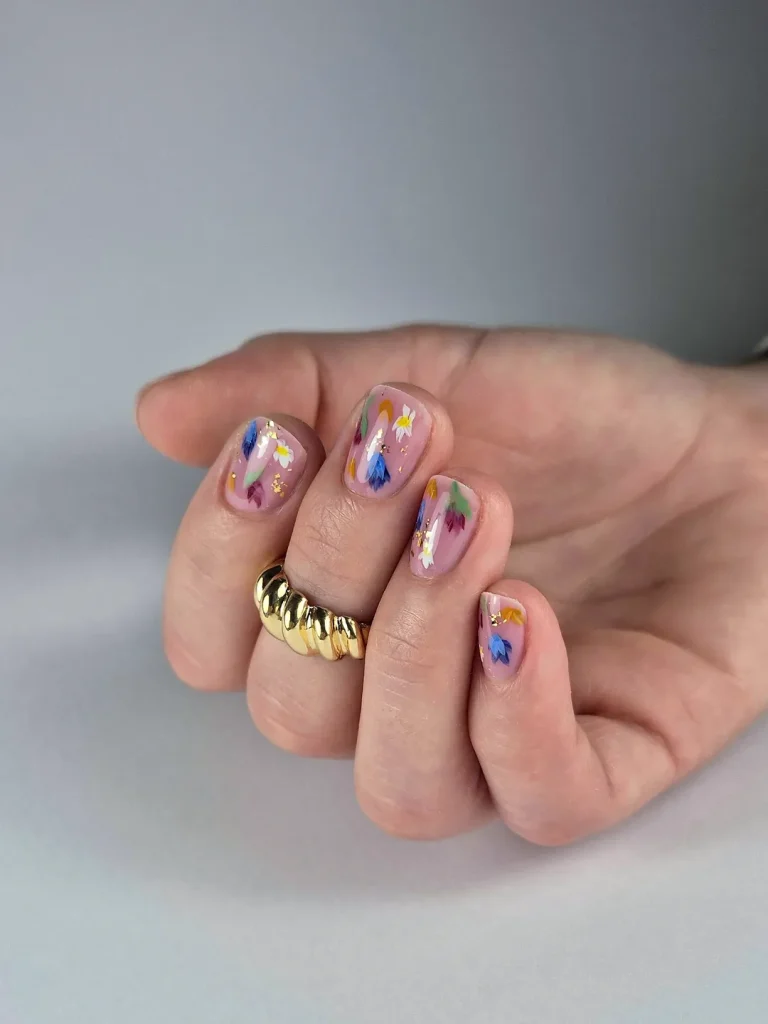 There’s something magical about nails that look like tiny works of art. This manicure feels like a miniature garden blooming across your fingertips, with soft floral strokes in Blue, yellow, purple, and green dancing over a sheer pink base. The subtle gold flecks add a little sparkle, making the design feel delicate and artistic rather than overwhelming.