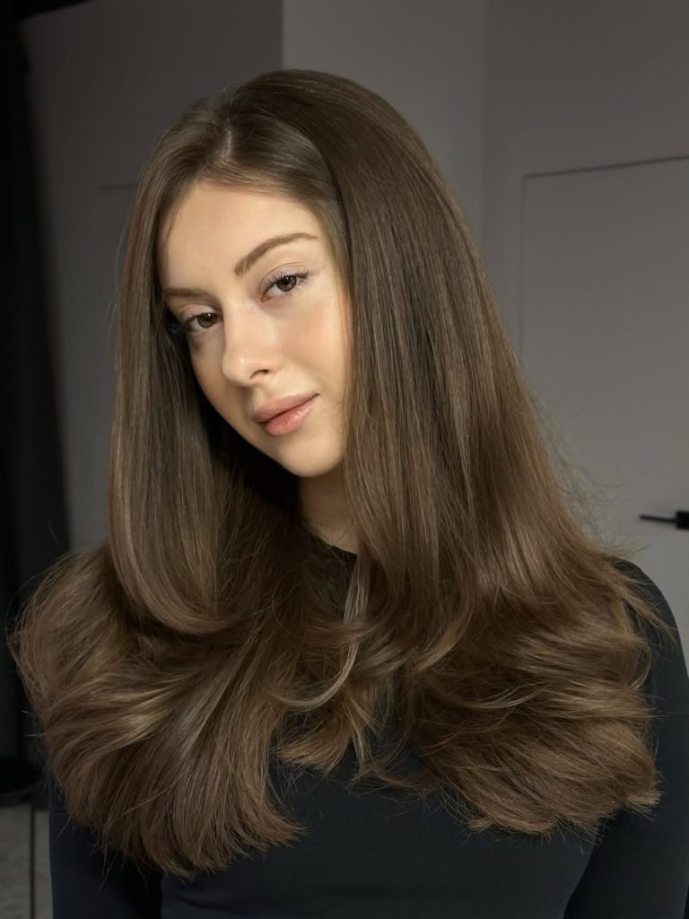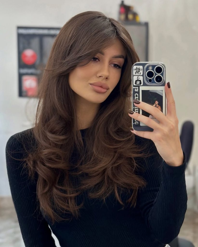 This hairstyle feels like pure confidence—Long, flowing brunette hair with soft waves that catch the light in all the right ways. It has that romantic, slightly undone vibe that makes you look like you’ve just stepped out of a slow Sunday afternoon. The Layers bring life and bounce, giving the whole look a sense of movement that feels youthful without trying too hard.