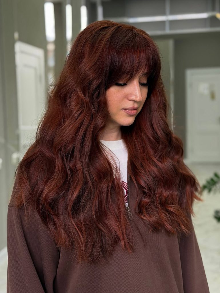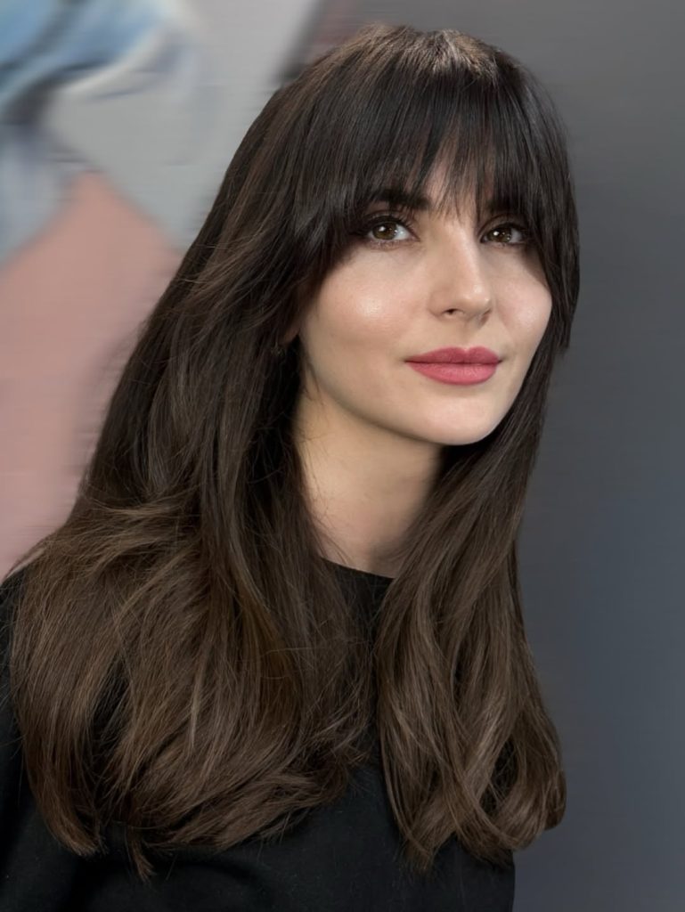 This hairstyle has that relaxed, slightly undone charm that feels so current right now. The Long Layers fall effortlessly, while the soft Bangs blend into the face-framing pieces, creating movement without looking too styled. It’s the kind of look that feels approachable, effortless, and quietly stylish all at once.