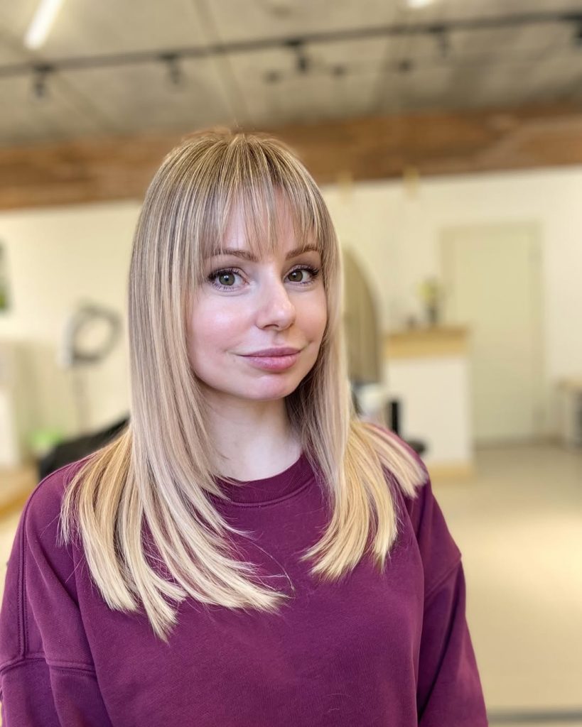 This look feels bright, fresh, and just a little bit flirty—the kind of Blonde hairstyle that instantly lifts your whole mood. The sleek Layers fall neatly around the shoulders, while the full Bangs add a youthful softness that draws attention to the eyes. It’s clean, chic, and quietly playful all at once.