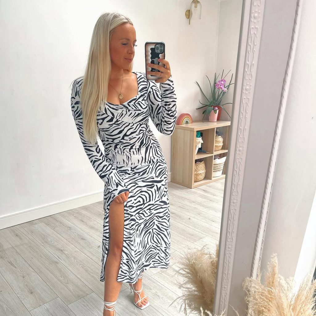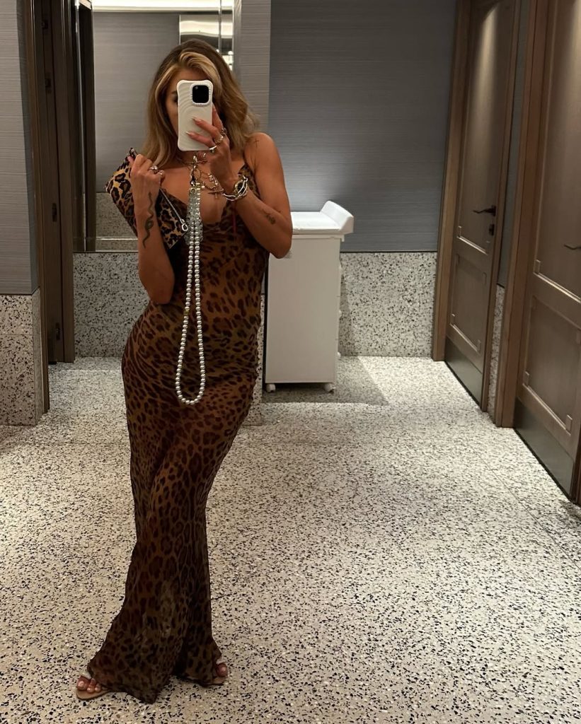A luxurious animal-print maxi dress that combines a bold, sultry confidence with refined glamour.