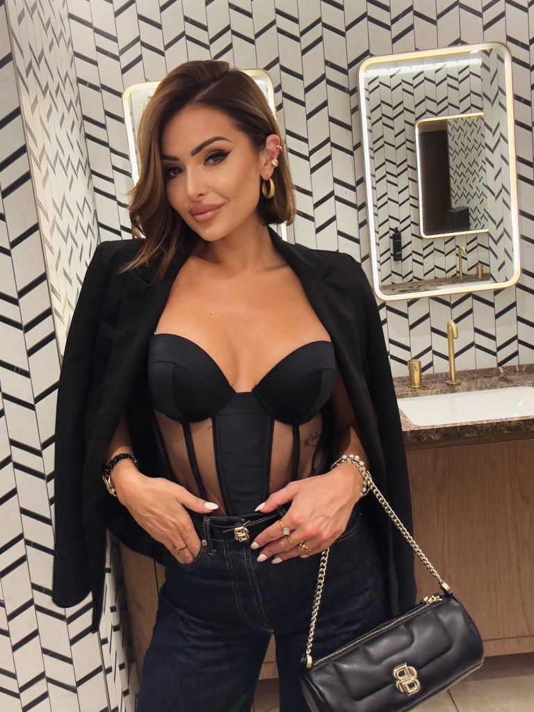 A black corset paired with denim and a blazer brings that bold-meets-polished balance perfect for a city dinner or trendy rooftop night.