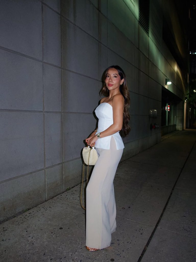The soft white strapless top paired with flowing wide legs gives an instantly elegant, minimal look ideal for outdoor summer or spring dining.