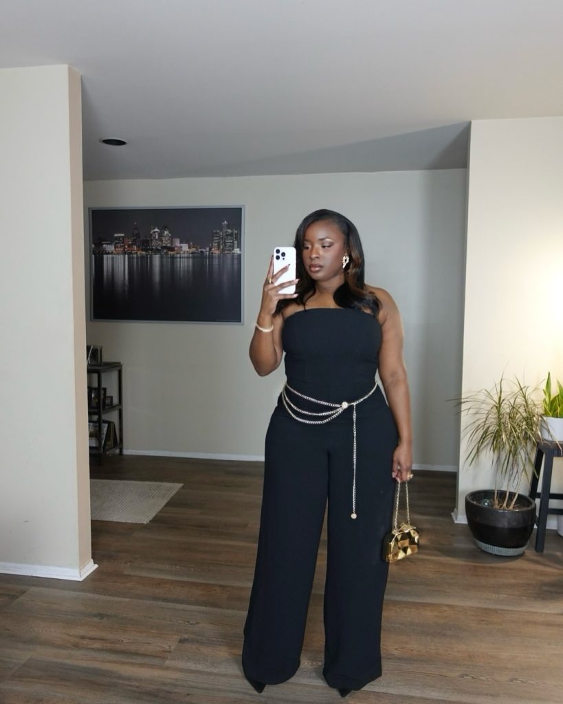 A strapless black jumpsuit with gold accents that brings instant polish—great for a confident, fashion-forward look.
