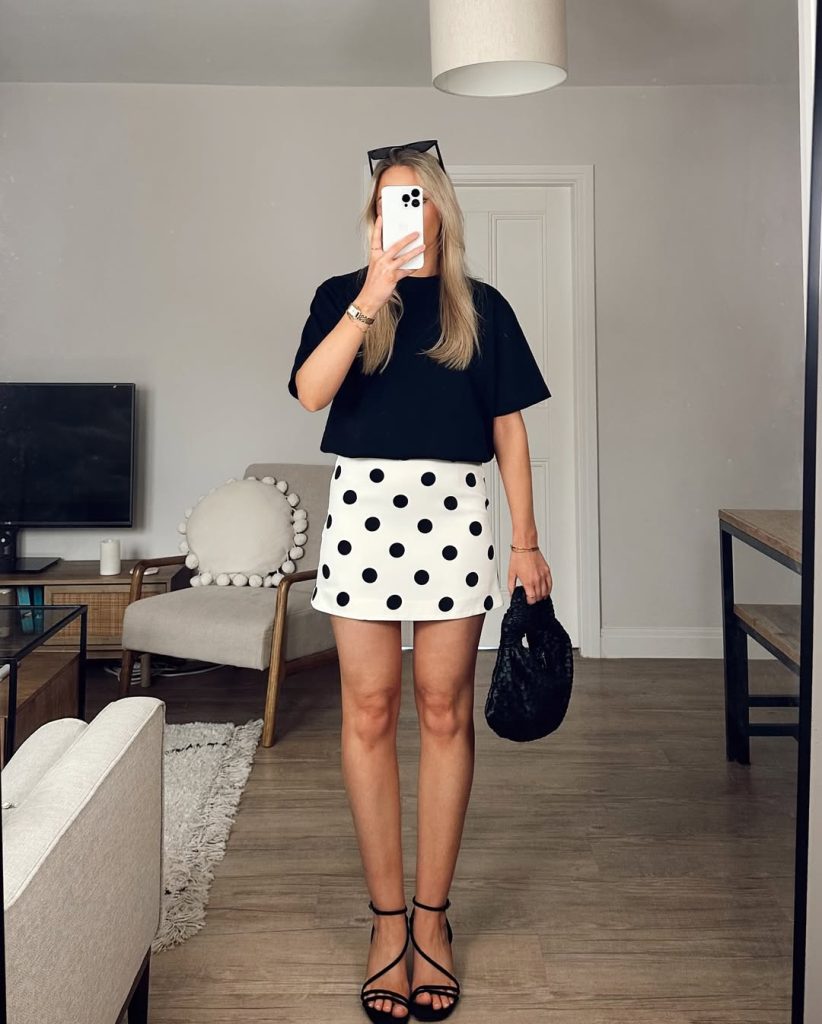 This outfit embodies effortless charm—great for brunch dates, boardwalk strolls, or a relaxed summer movie night. For more elegant occasions, swap the sandals for kitten heels. What to avoid? Over-accessorizing. The print already does the work, and keeping it minimal preserves that modern, fun balance.