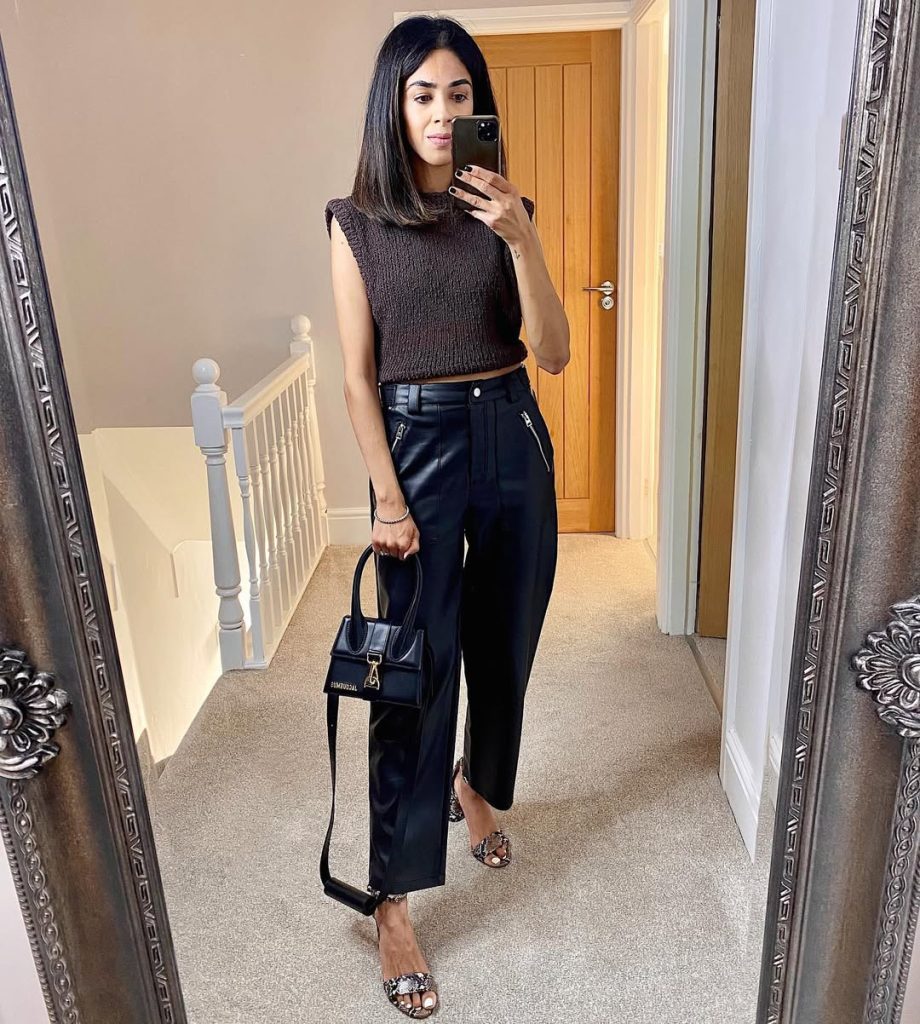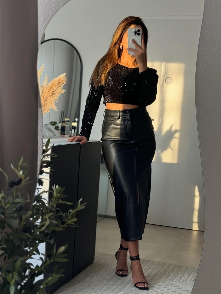 Nothing says “I’m here for a night to remember” like a sparkling cropped top paired with a sleek leather skirt. This combo leans into that winter date, nightclub-dinner energy while still staying polished and classy.