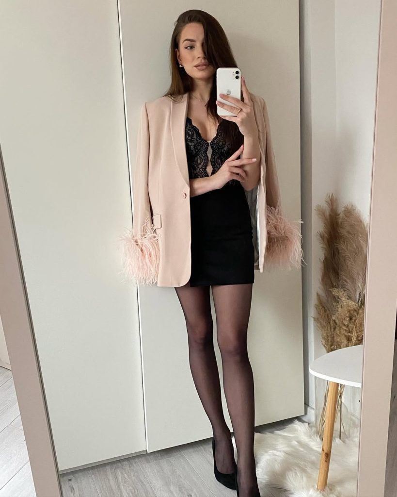 A blush blazer paired with a lace cami and black mini skirt creates a fusion of feminine softness and sharp tailoring.