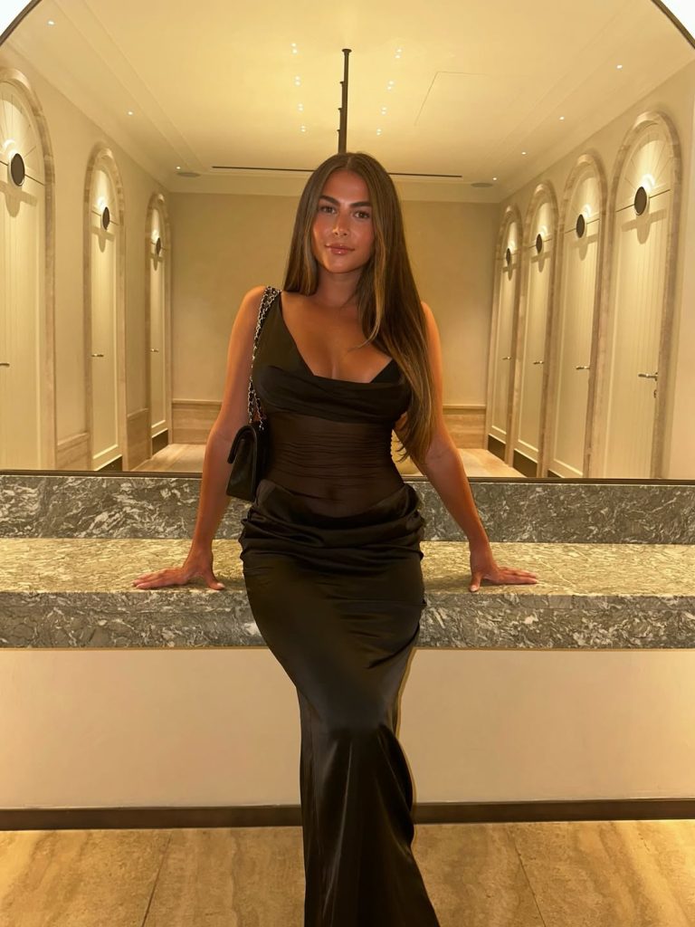 A sculpted satin gown with mesh detailing that brings a glamorous touch to evening wear—ideal for someone who prefers refined sensuality.