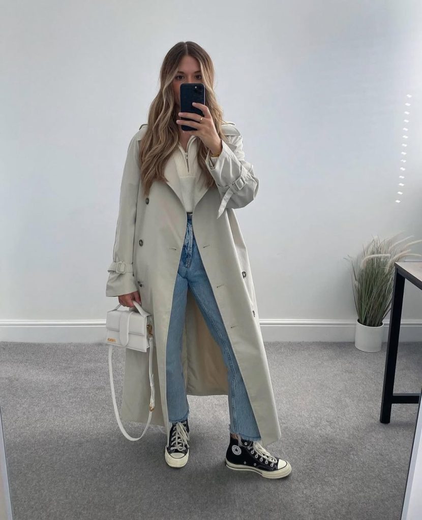 A neutral trench coat layered over denim delivers one of the most reliable 2026 trends for unpredictable early spring days.
