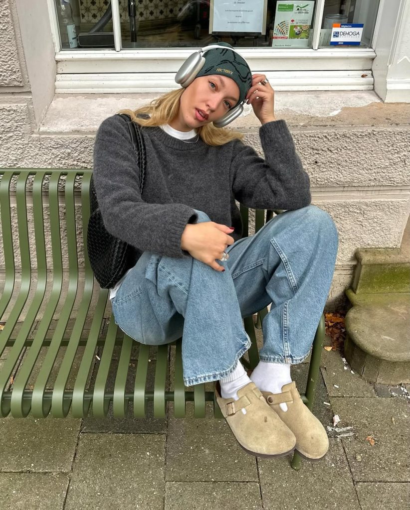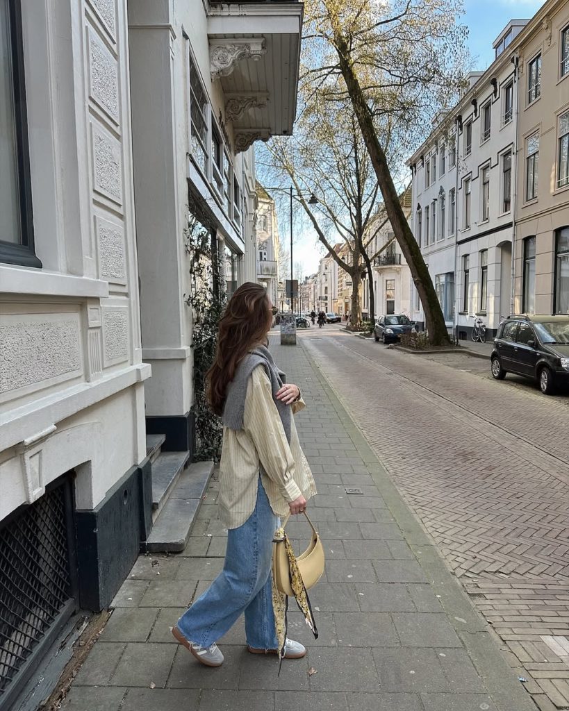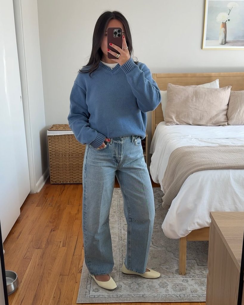 A relaxed knit paired with classic denim creates a casual early spring look that feels easy, calm, and quietly polished.