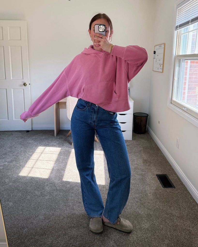 A cropped hoodie and jeans deliver a youthful, cute take on casual street styles for early spring.