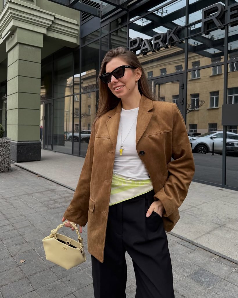 This look feels especially aligned with European city style, blending polish with ease. It’s great for lunch meetings, gallery visits, or casual client appointments for work. Keep shoes minimal and avoid loud prints—the suede texture already carries the outfit.
