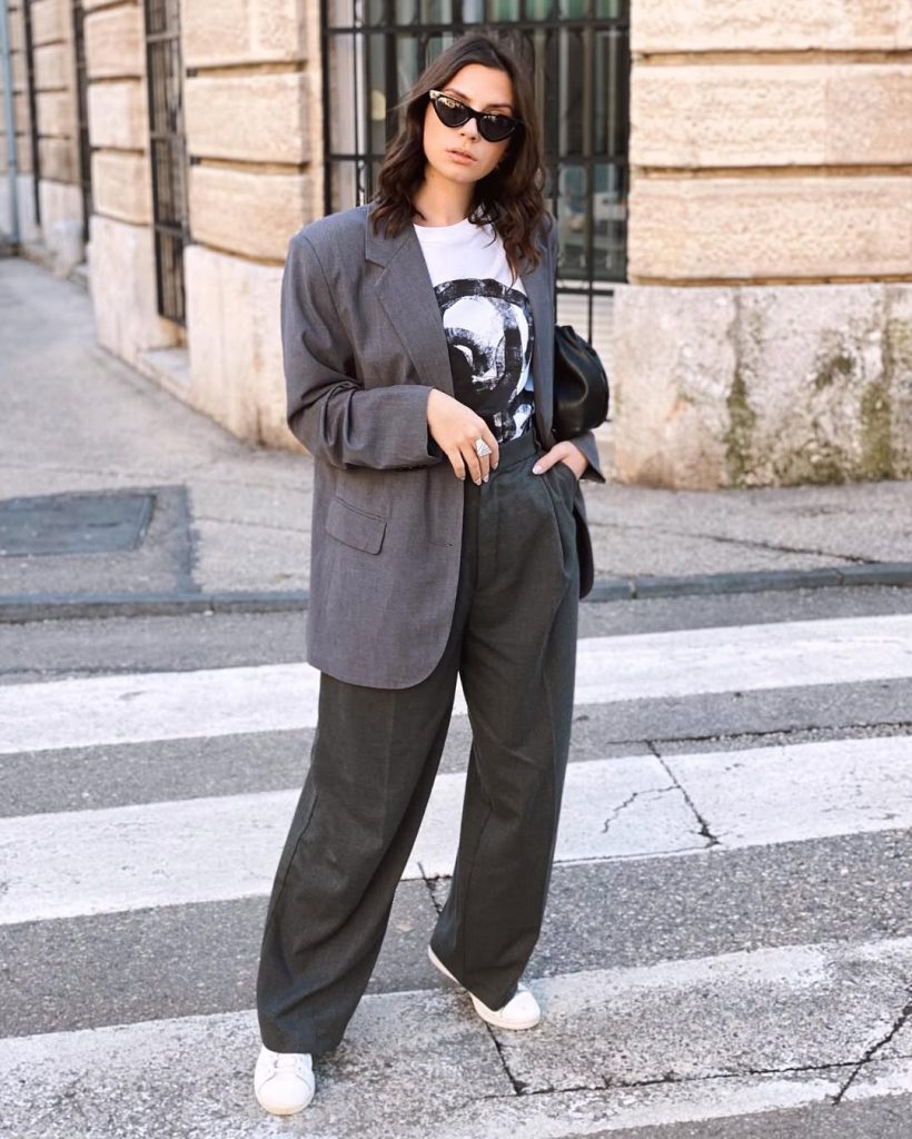 This is one of those 2026 trends that works equally well for work and after-hours plans. The graphic tee keeps it modern, while the blazer grounds the look. Skip flashy jewelry—clean lines matter here. Perfect for creative offices, client coffee meetings, or city commuting in cold early spring mornings.